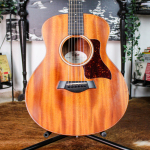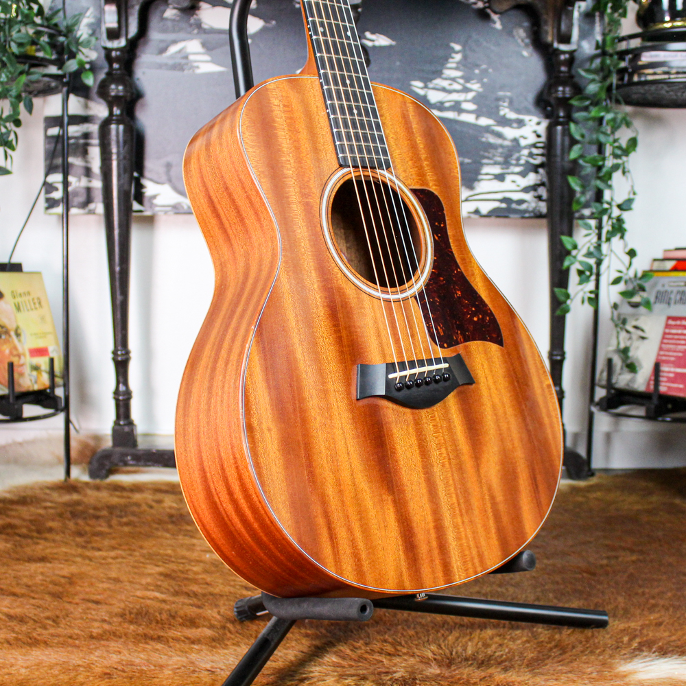 Taylor-branded gig bag. The GS Mini has earned a reputation as one of the best compact acoustics ever made — portable and easy to play, but still remarkably full and rich in tone. The all-mahogany construction gives this one a warm, focused midrange response with a dry, woody character.