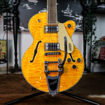The G5655TQM Electromatic Center Block Jr. Single-Cut with Bigsby® features a smaller-sized body with stunning quilted maple top, back, and sides and a chambered spruce center block for dynamic resonance, high gain power and lightweight comfort. A lower set maple neck offers effortless access and performance, while the 12"-radius laurel fingerboard with 22 medium jumbo frets and Neo-Classic™ thumbnail inlays offers excellent playability.