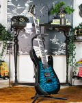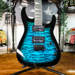 The JS Series Dinky® JS20 DKAQ 2PT has a poplar body with quilt maple art grain top, bolt-on maple speed neck with graphite reinforcement and a 12"-16" compound-radius bound amaranth fingerboard with 24 jumbo frets and pearloid sharkfin inlays.