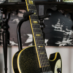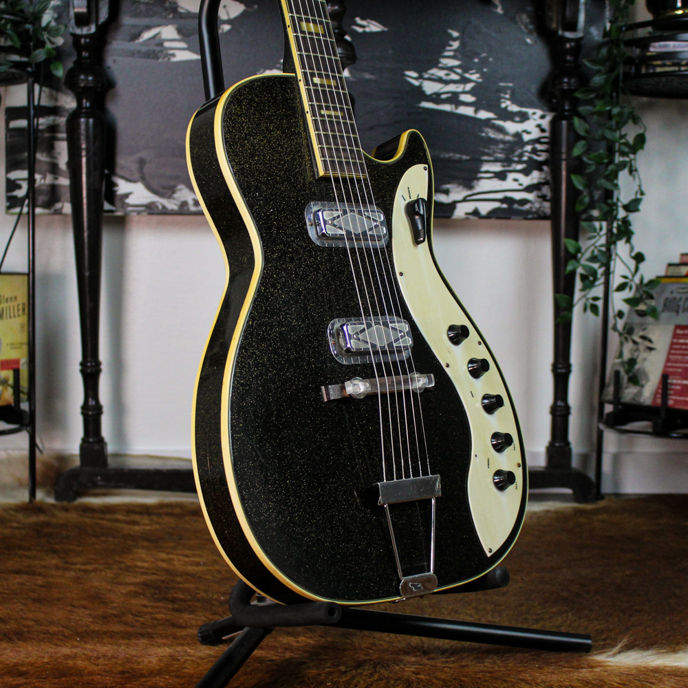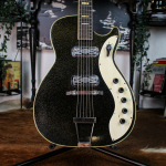 semi-hollow body with DeArmond-style foil pickups controlled by the classic “blender” circuit — giving you all the usual neck/bridge tones but also allowing you to blend the two pickups together on the fly. It’s an extremely musical wiring setup and part of what makes these so fun to play. The Black Sparkle finish pops under the light, and the aging on this particular example gives it a ton of vintage charm.