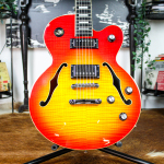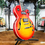 This model features a semi-hollow body with a center block, dual humbuckers, and a familiar control layout that keeps things intuitive. It has a warm, rounded tone with good clarity, working equally well for clean sounds and pushed tones without excessive feedback. The neck has a comfortable profile that feels approachable right away, and the guitar balances nicely whether seated or on a strap.